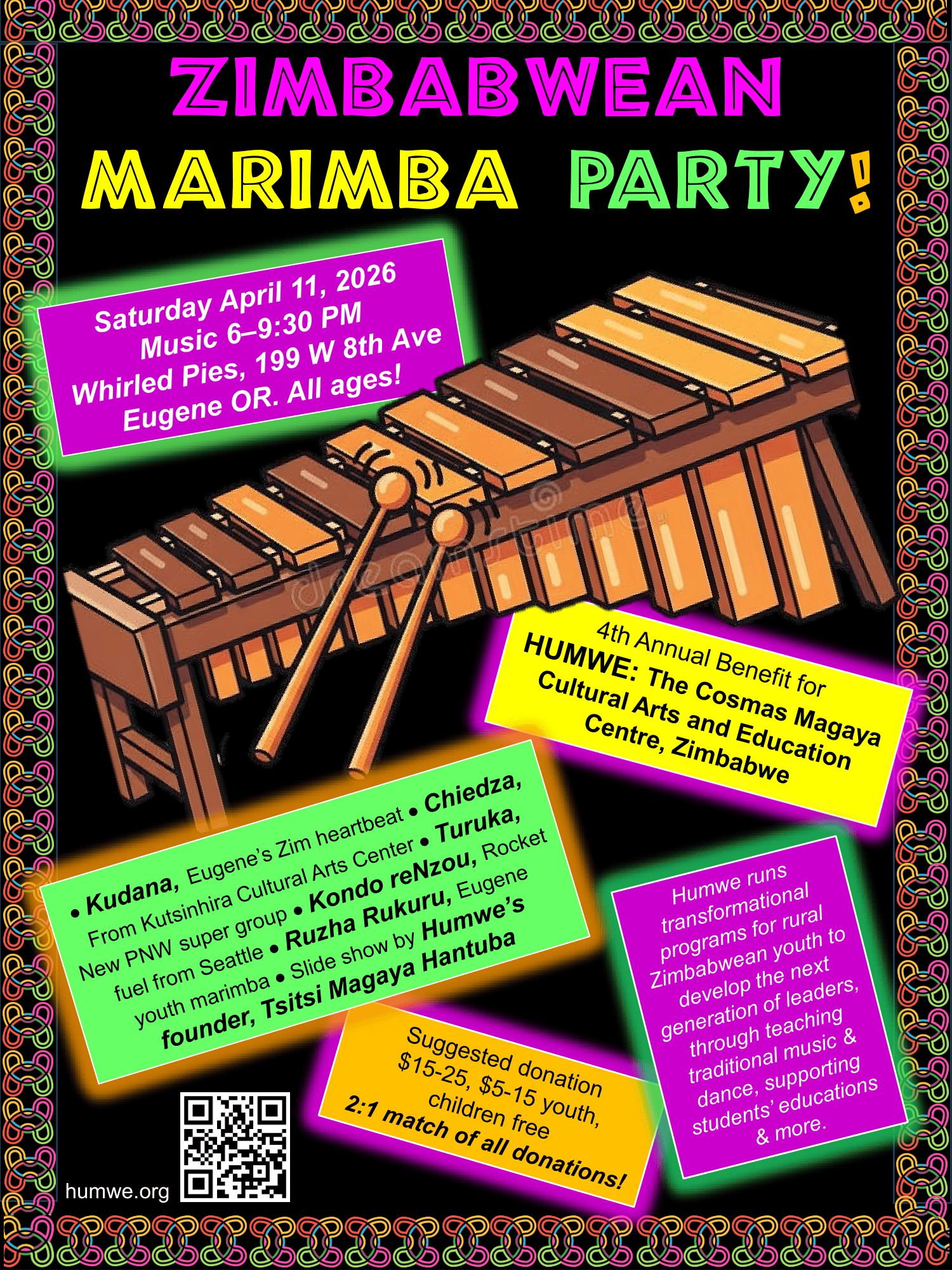 The 4th annual benefit event for HUMWE: the Cosmas Magaya Cultural Arts and Education Centre in Zimbabwe is just around the corner! Don’t miss this incredible night of nonstop music from the Pacific Northwest’s finest marimba bands! The event will be hosted at Whirled Pies onĀ Saturday April 11 from 5:00-9:30pm. Enjoy the music, raffle, and merchandise tables, as well as Whirled Pies delicious food an drink. Entry to the event is by donation, and all donations made during the event are double matched!
